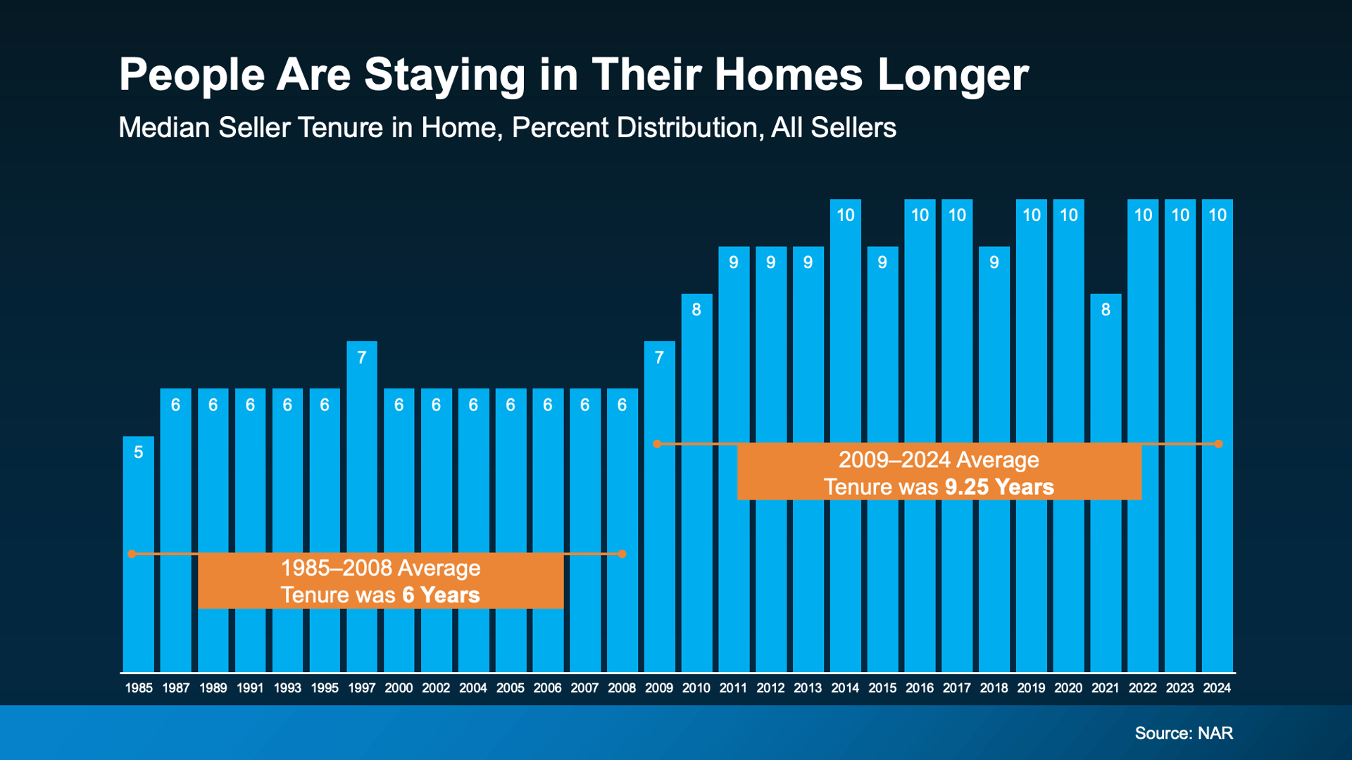National Association of Realtors (NAR), shows the average homeowner stays in their home for about 10 years now (